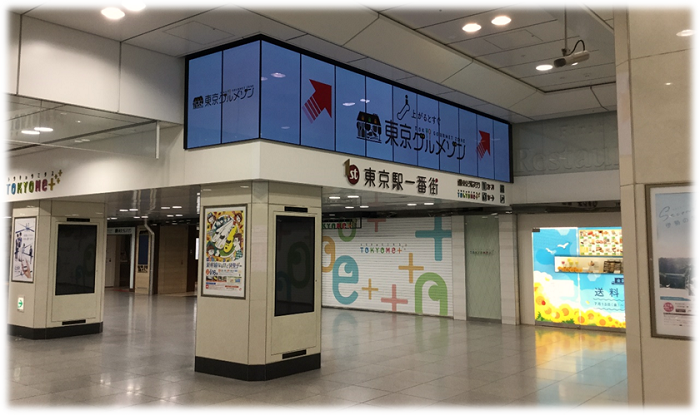 - 参考図は、東京ステーション開発株式会社様向け、東京駅八重洲北口付近に設置したOLED 12面を使用したデジタルサイネージ、